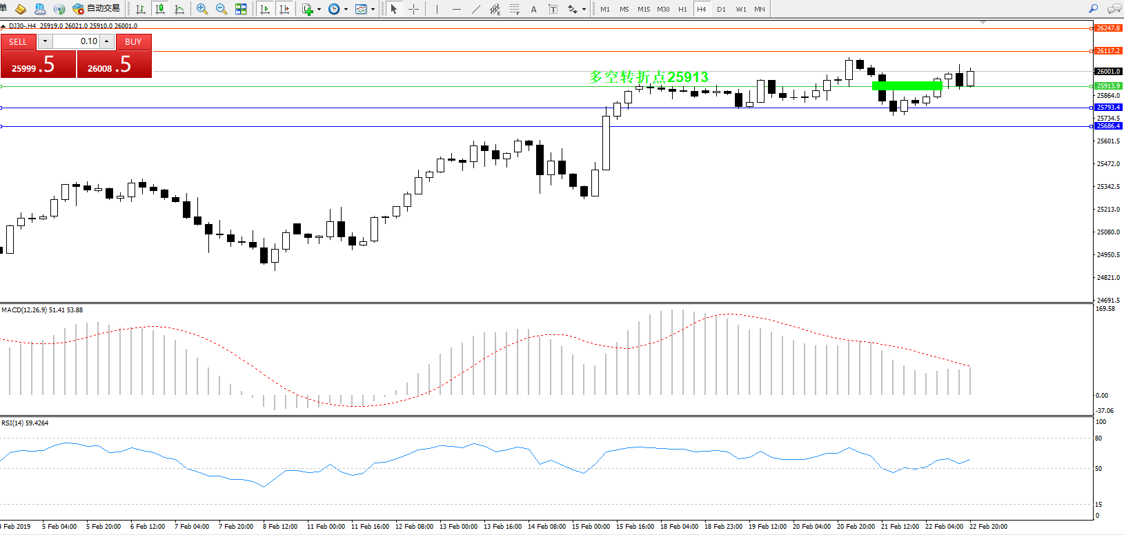 道琼斯指数DJ30—— 4小时K线图显示: