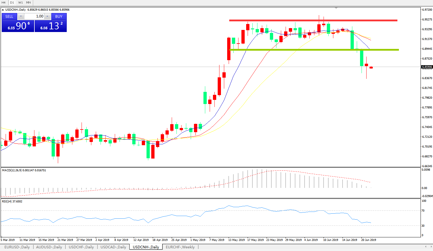 交易策略: 在6.8880之下,看跌,目标价位为6.8100,然后为6.7600。