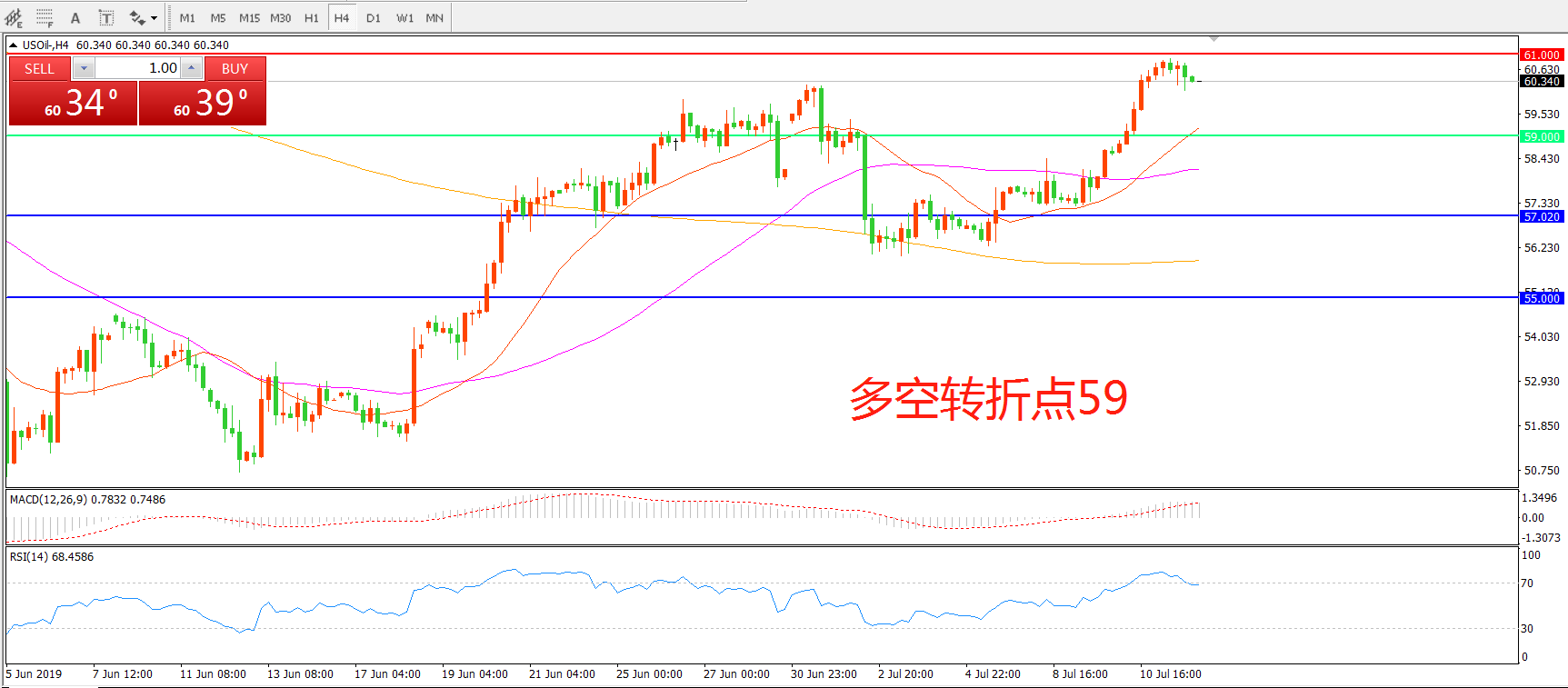由于热带风暴“巴里”周四加剧,美国石油公司关闭了100多万桶/日的石油生产,相当于墨西哥湾产量的53%,而美国17%的原油供给和5%的天然气供给来自墨西哥湾。消息面多空交织的情况下下,美油冲高回落,最终收报60.36美元/桶