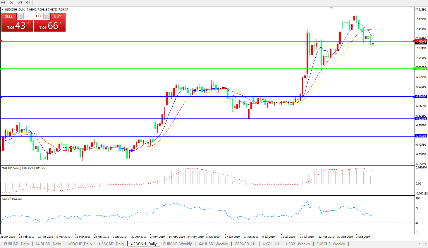 备选策略: 在7.0000之下,看跌,目标价位为6.9010,然后为6.8210。