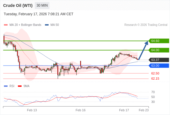 在 63.00 之上,看涨,目标价位为 64.00 ,然后为 64.60 。