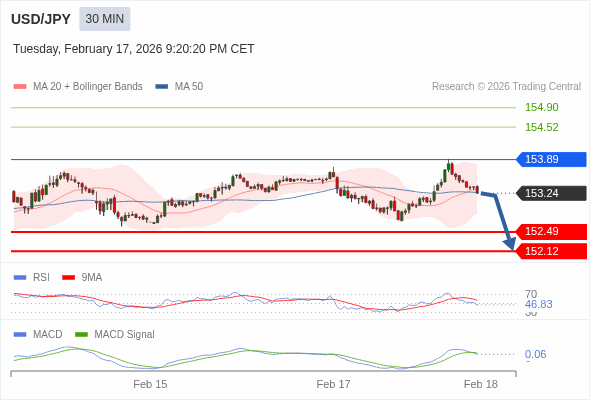 美元/日元 当日内 : 看跌,当 153.89 为阻力位。