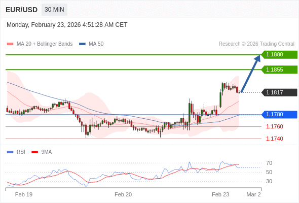 在 1.1780 之上,看涨,目标价位为 1.1855 ,然后为 1.1880 。