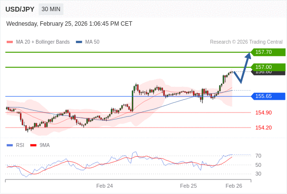 在 155.65 之上,看涨,目标价位为 157.00 ,然后为 157.70 。