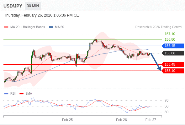 在 156.45 之下,看跌,目标价位为 155.45 ,然后为 155.10 。