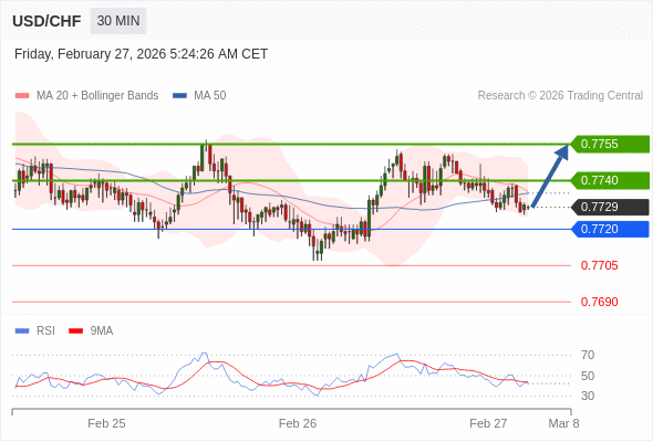 在 0.7720 之上,看涨,目标价位为 0.7740 ,然后为 0.7755 。