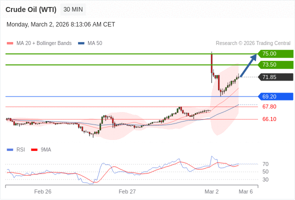 在 69.20 之上,看涨,目标价位为 73.50 ,然后为 75.00 。