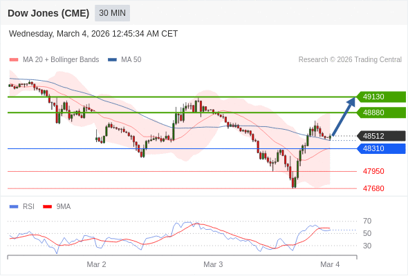 在 48310 之上,看涨,目标价位为 48880 ,然后为 49130 。