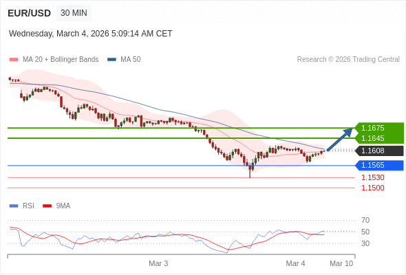 在 1.1565 之上,看涨,目标价位为 1.1645 ,然后为 1.1675 。
