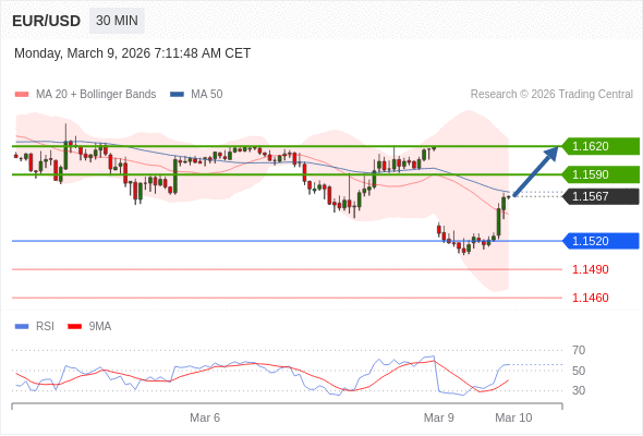 在 1.1520 之上,看涨,目标价位为 1.1590 ,然后为 1.1620 。