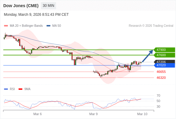 美国道琼斯指数期货 (H6) 当日内: 在47020之上,看涨。