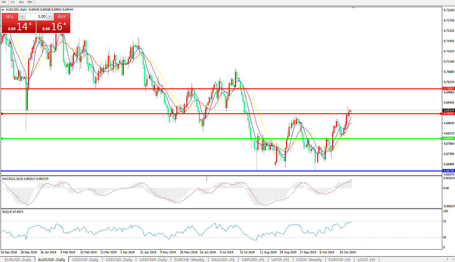 交易策略:0.6800上方看涨,目标0.6900、0.7000