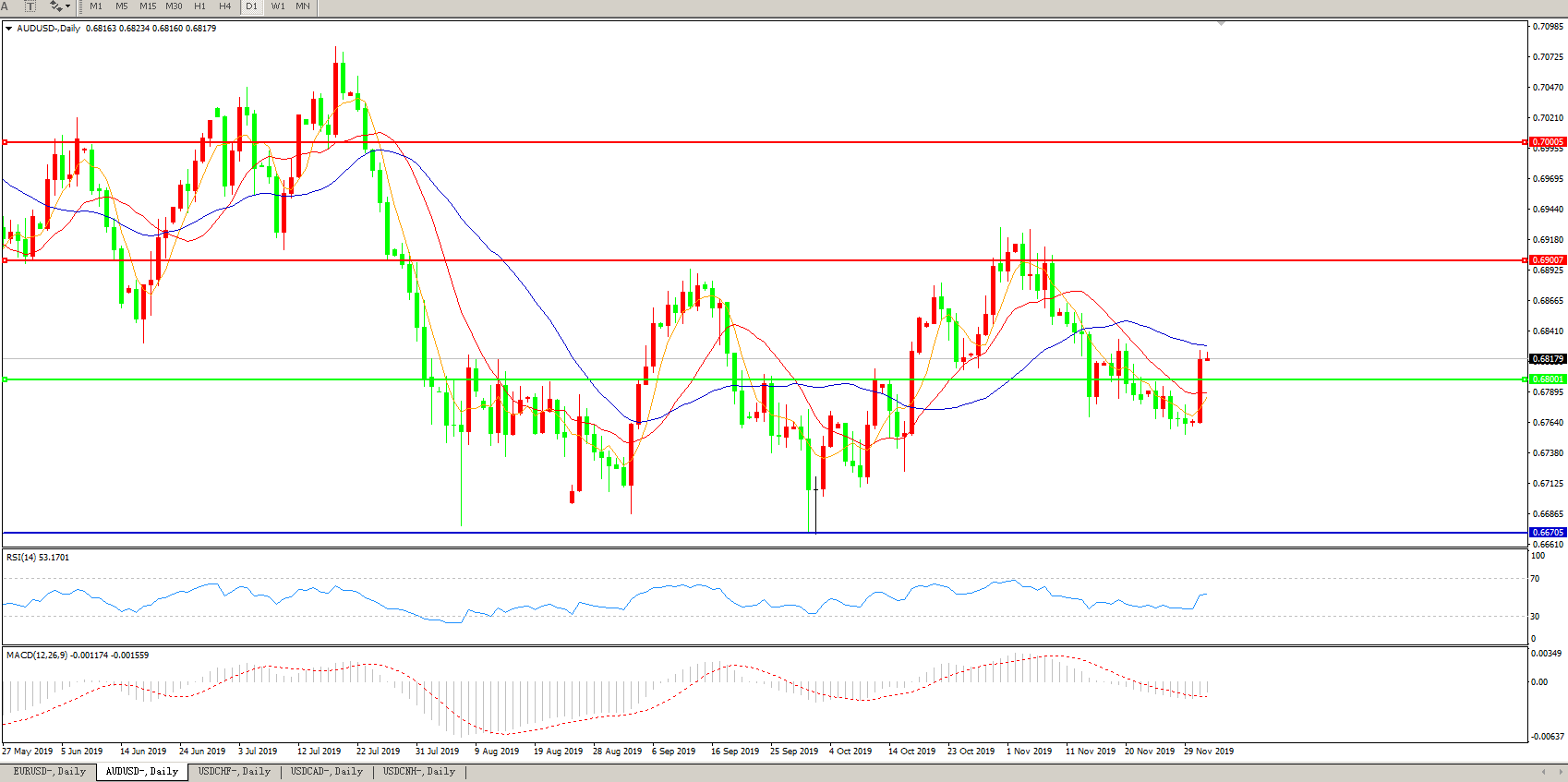 交易策略:0.6800上方看涨,目标0.6900、0.7000