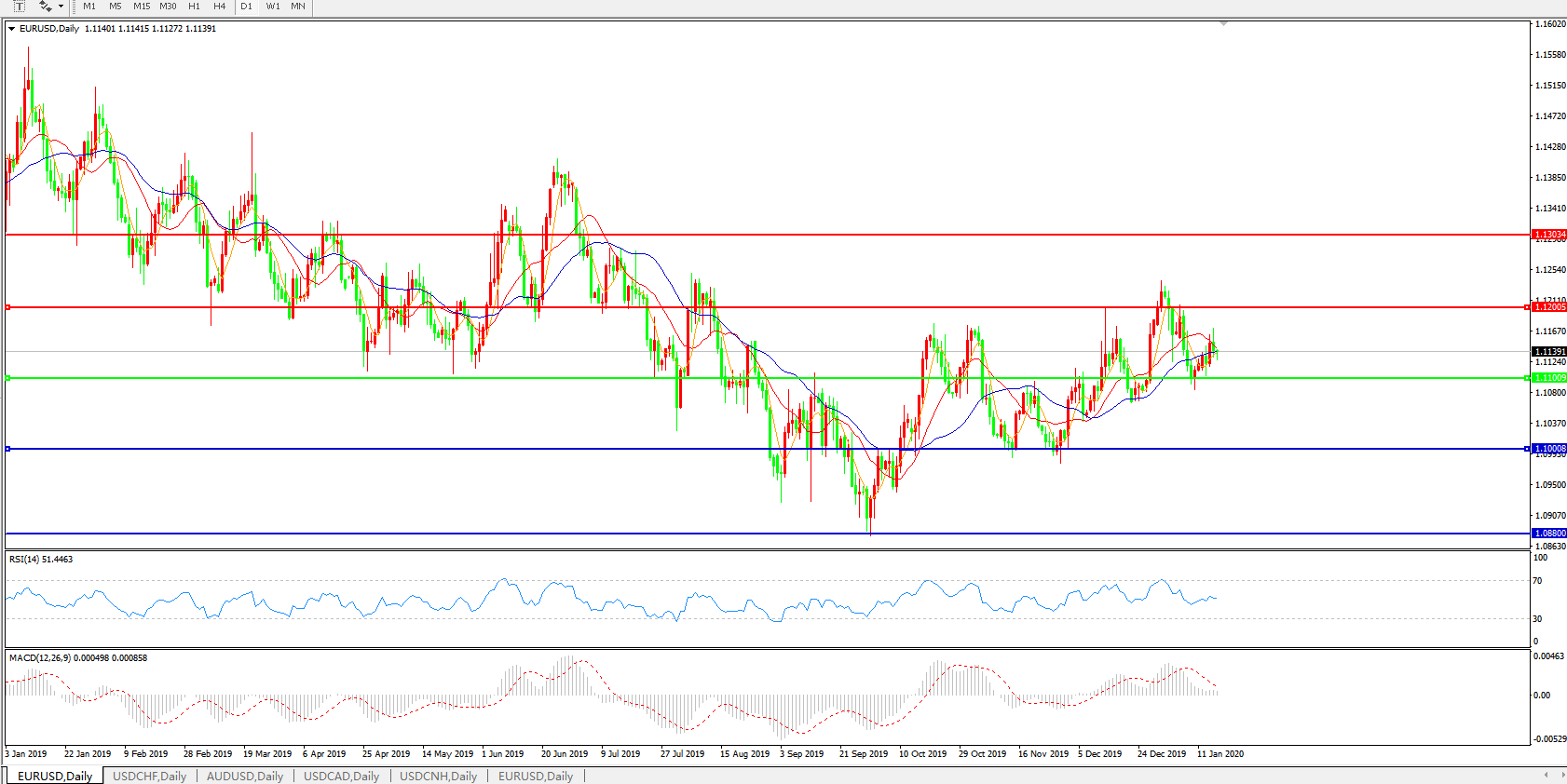 技术面简析:日图均线粘合有转弱迹象汇价冲高回落仍然守住1.11关口MACD继续下行切量能不足 RSI逐步走缓,预计短期汇价大概率将整理中延续升势