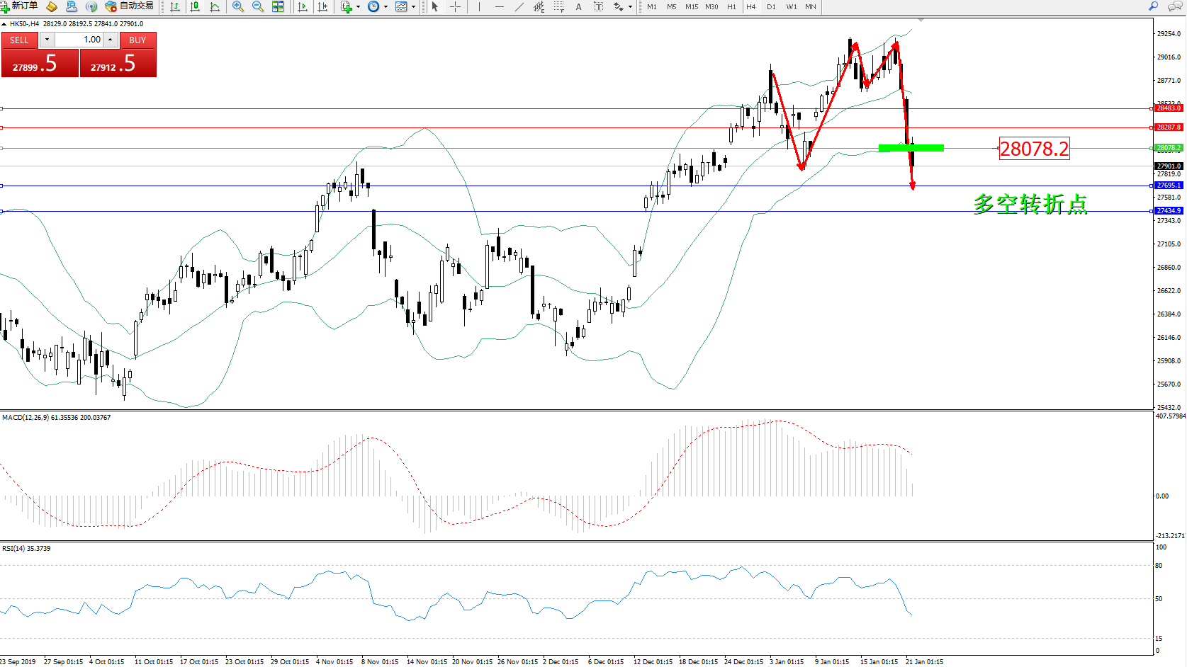 恒指HK50 ——4小时K线图显示: