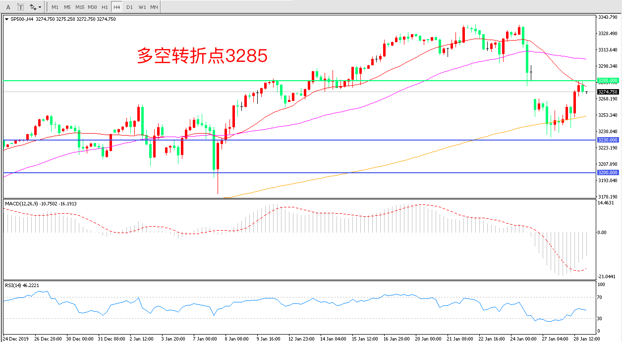 4小时图看,标普500200周期均线为支撑反弹,整体走势有回暖迹象短期均线走平MACD绿柱减少RSI指标走平,日内延续震荡概率较大