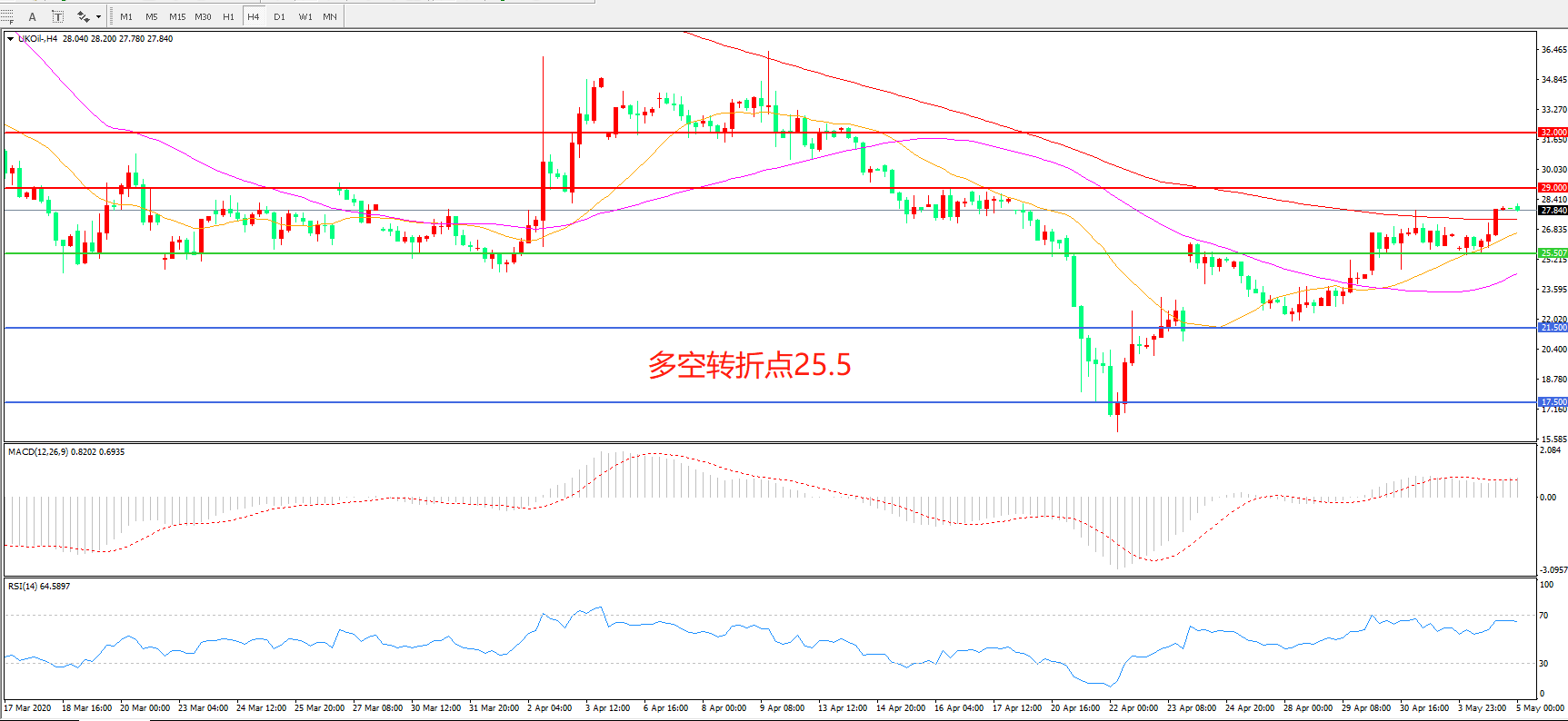 4小时图看,油价震荡上行,200周期均线被突破,整体表现强势, MACD红柱增加,RSI指标走平,日内延续上行概率较大。