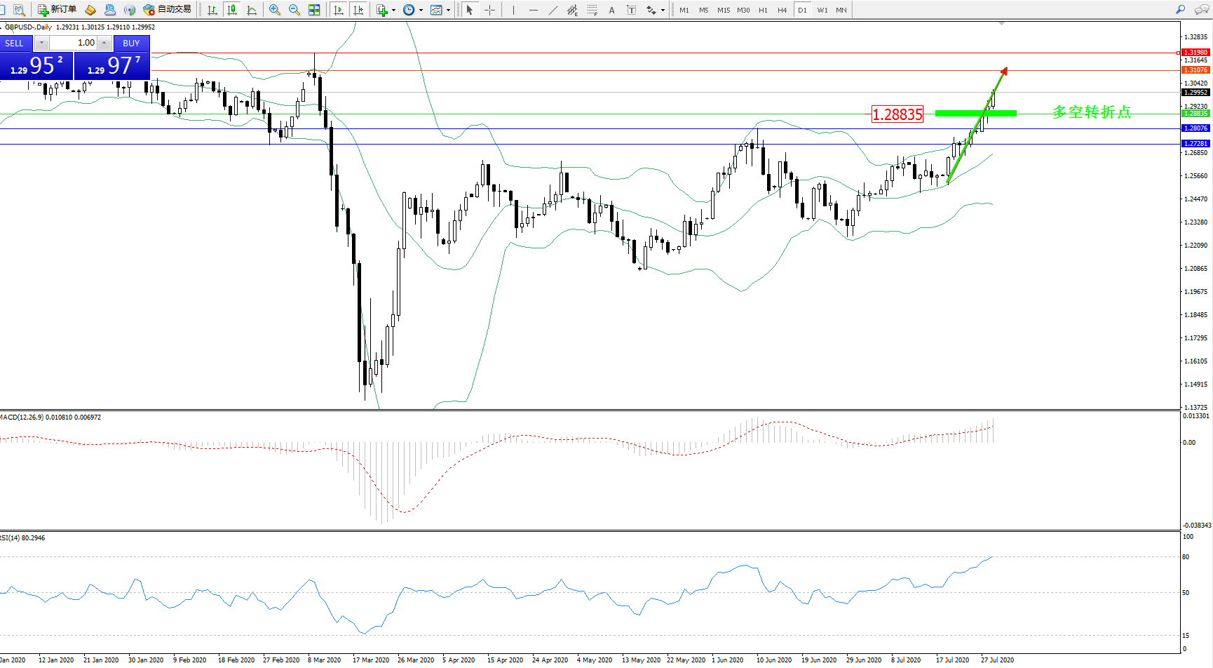 交易策略:1.28835上方看涨,目标1.31076、1.31980