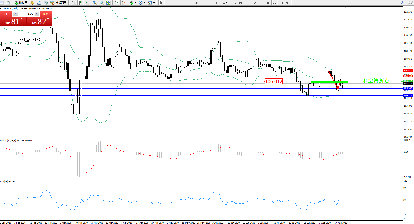 备选策略:106.012上方看涨,目标106.464、106.981