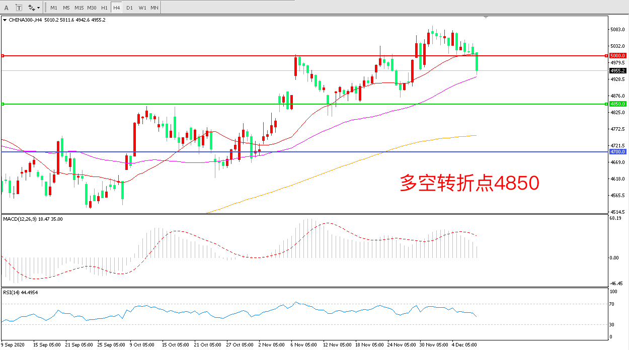 4小时图看,沪深300位震荡后大幅下挫短期表现十分疲软均线系统依然呈多头排列55周期均线成为下方支撑MACD红柱减少RSI指标向下,日内延续震荡概率较大。