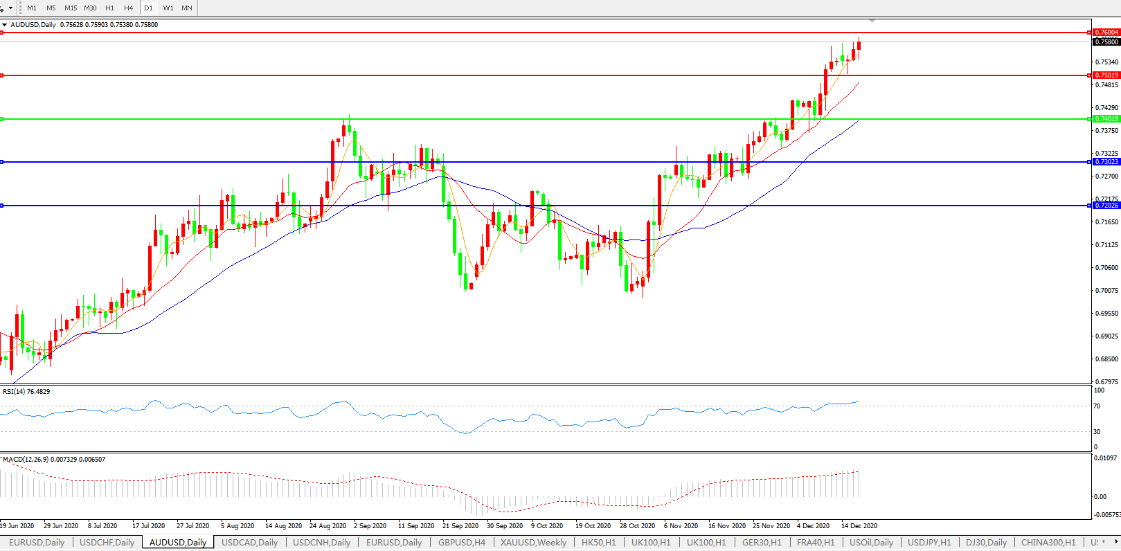 交易策略:0.7400上方看涨,目标0.7500、0.7600