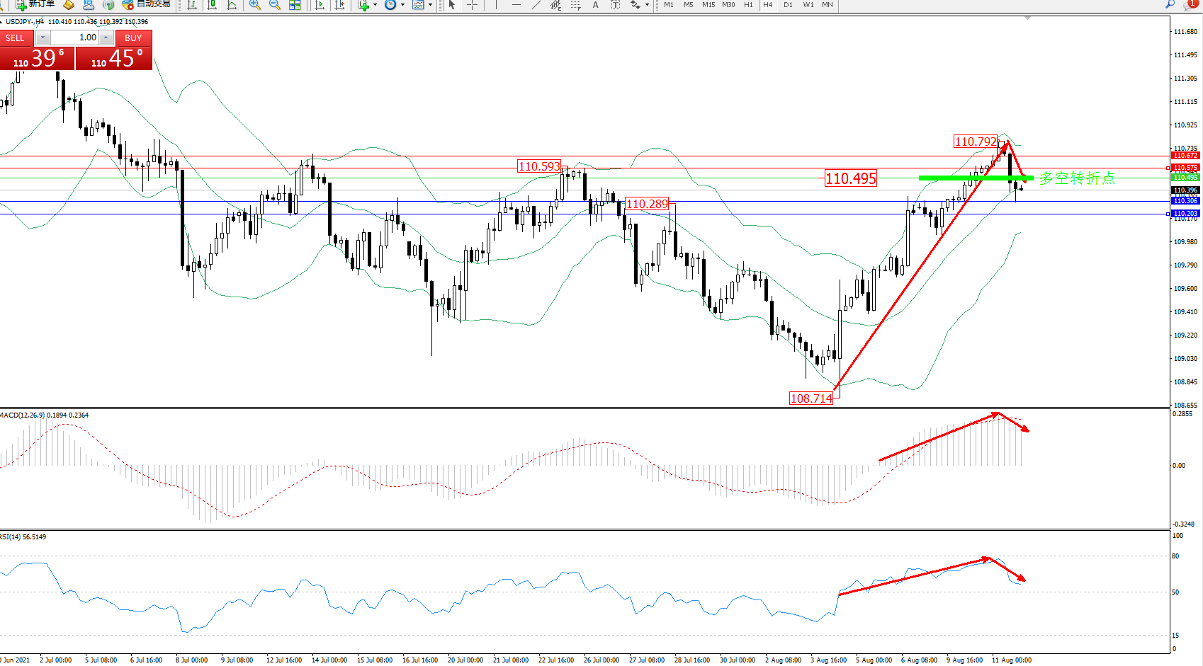 美元兑日圆高位回撤至110.396附近震荡,美债收益率在美联储缩减QE预期下继续走高,拉大了与同期日债的收益差,令日元计价资产面临额外抛压。虽然东南亚地区疫情风险仍对避险资产买需有推动作为,但更多资金正流向美元资产市场;美国7月消费者物价升幅较为温和,并未完全缓解成本上升对市场人气造成的压力。带动美元兑日元进一步破位上行并重新确认开年以来的上升趋势。日圆买盘持续涌入,维持短暂升值状态。