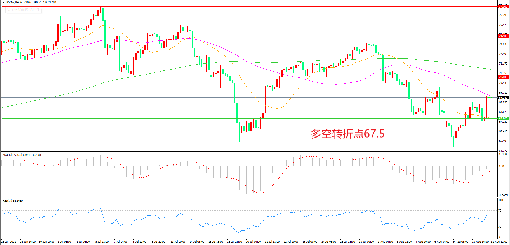 4小时图看,油价回踩67.50美元附近后再度反弹,短线行情回暖,55周期均线成为短期阻力,MACD绿柱缩短,RSI指标走平,油价震荡上行概率较大。