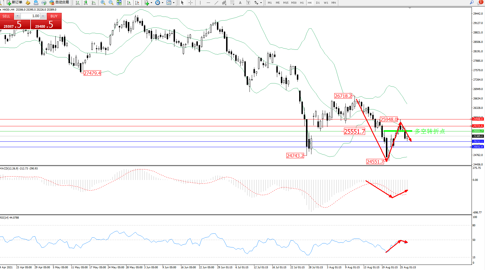 恒指HK50 ——4小时K线图显示: