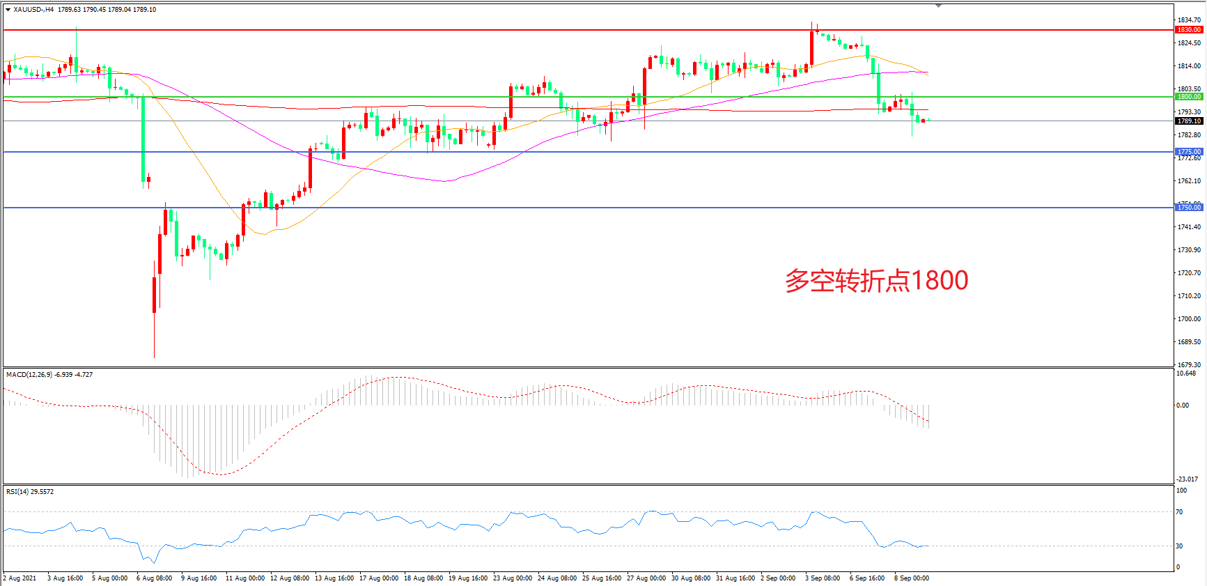 交易策略:在1800.00之下看跌,目标1775.00            1750.00