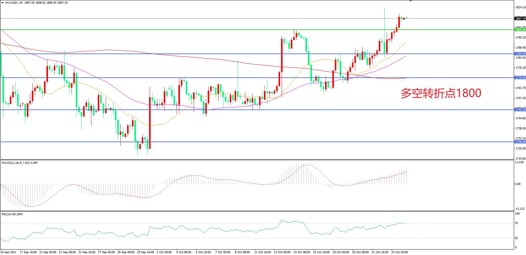周一(10月25日),美国国债收益率回落和对通胀的持续担忧提振了市场中的避险情绪,现货黄金大幅拉升,收报1807.88美元/盎司。鲍威尔近期的言论加剧了对通胀持续时间更长的担忧,投资这开始思索美联储可能会如何应对并推动将黄金作为通胀对冲工具的买盘走强,重点关注本周三大央行利率决议的表现。