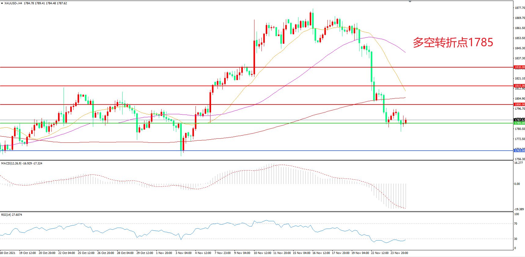 周三(11月24日),美联储会议纪要释放了愿为打压高通胀而加快Taper甚至提前加息的信号,市场对美联储鹰派倾向提前加息的期望不减,金价延续暴跌后的低迷表现,收报1788.18美元/盎司。鲍威尔连任将确保美联储政策连续性给黄金施加了下行压力,而多位美联储官员都发表了不同以往立场的偏鹰讲话,美联储可能会在接下来的几次会议上采取更强硬的政策。