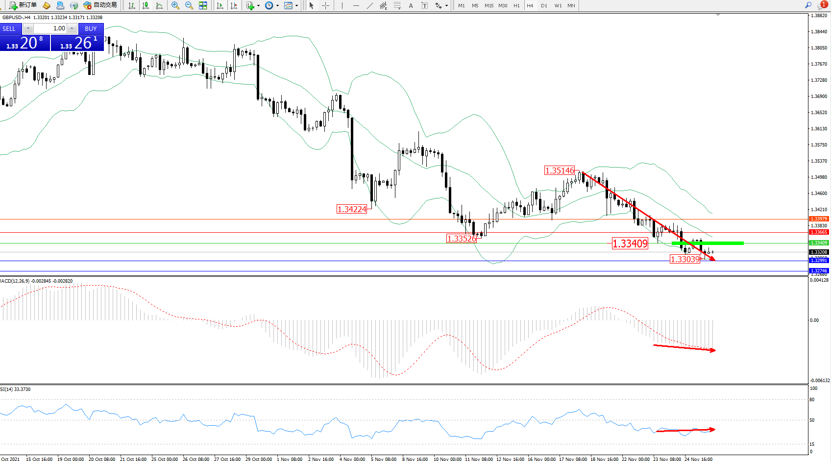 技术点评:空头动力延续布林带指标通道中下轨区间持续震荡下行,低位抵达1.33039位置附近后开始整理,短期空头动力有继续下行态势,且未见最终止步迹象,布林带指标呈收口走势持续震荡向下移动中,MACDX指标处于空头区域维持整理平缓下行,RSI指标处于空头区域持续弱势徘徊中;