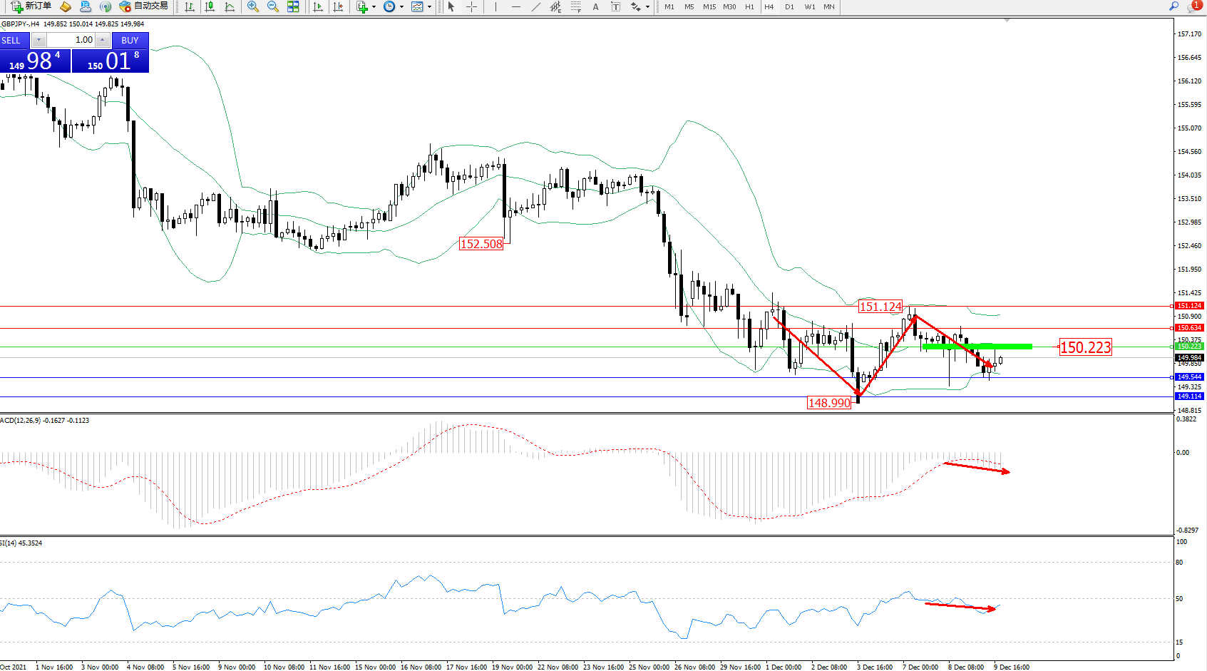 技术点评:空头动力维持在布林带指标通道内维持窄幅整理平移,短期或将持续震荡整理,布林带指标呈收口走势持续中,此前低位148.990位置近在咫尺,破位在即,MACD指标处于0轴线下方空头区域维持整理缓慢下行后平移,RSI指标处于50均衡线下方维持整理平移中;