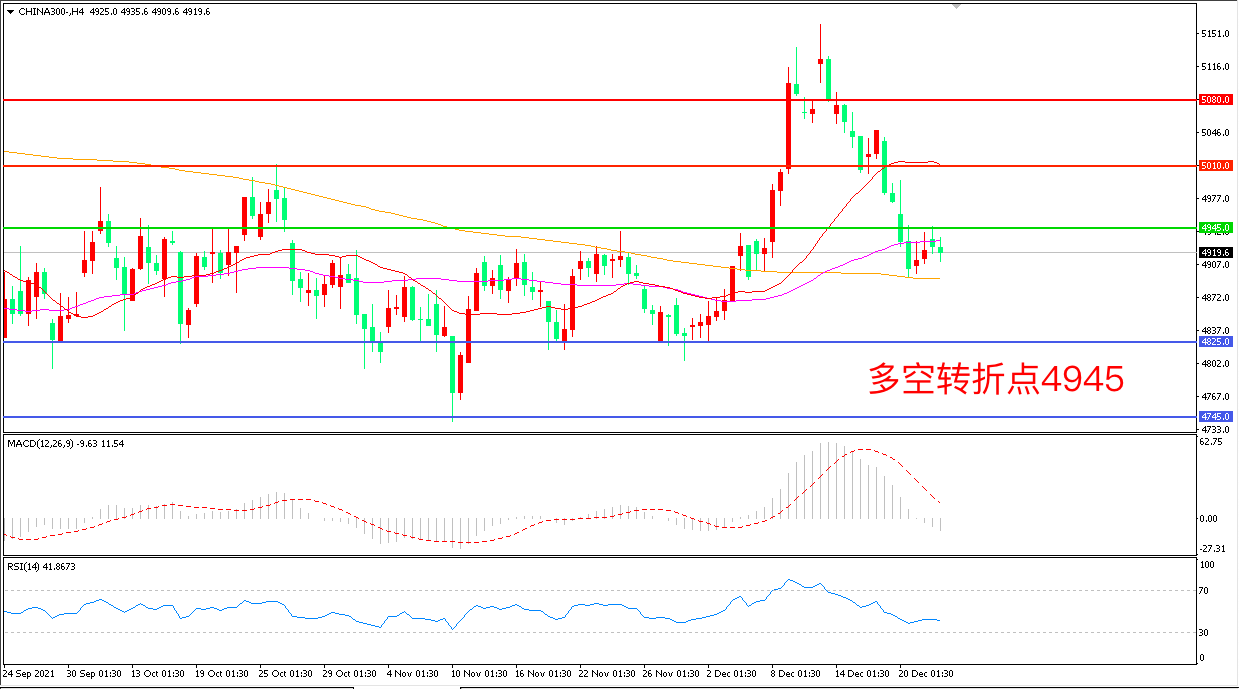 4小时图看,沪深延续低位震荡,短期无明确方向,形态上看空头趋势未改,4945成为多空分水岭,200周期均线成为短期支撑, MACD绿柱增加,RSI指标走平,日内震荡下行概率较大。