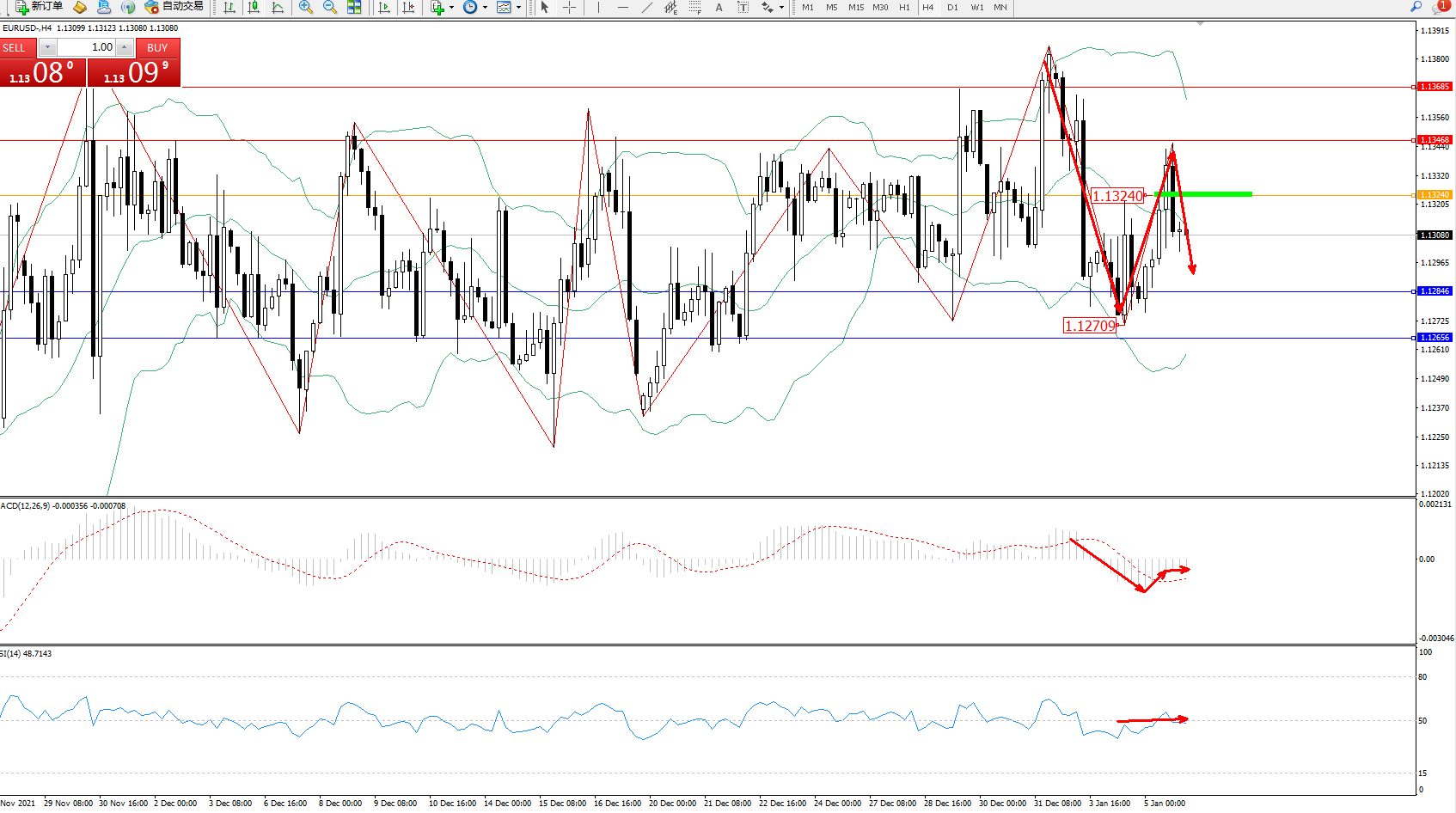 交易策略:1.13240下方看跌,目标1.12846、1.12656