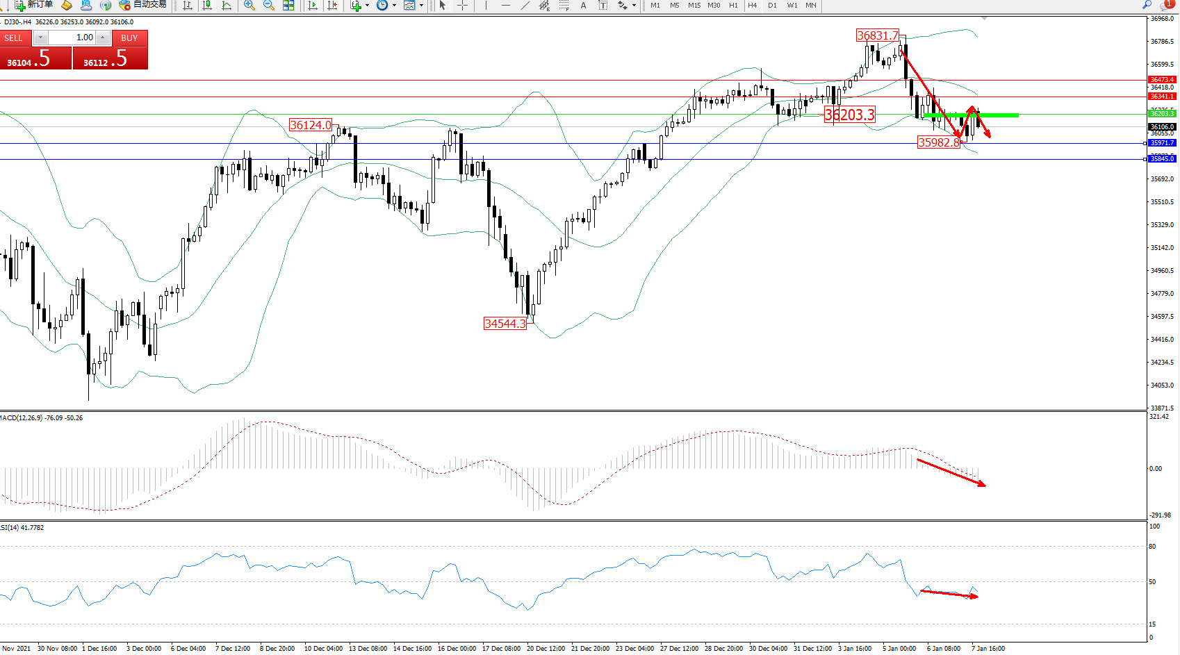 道琼斯指数DJ30——4小时K线图显示:
