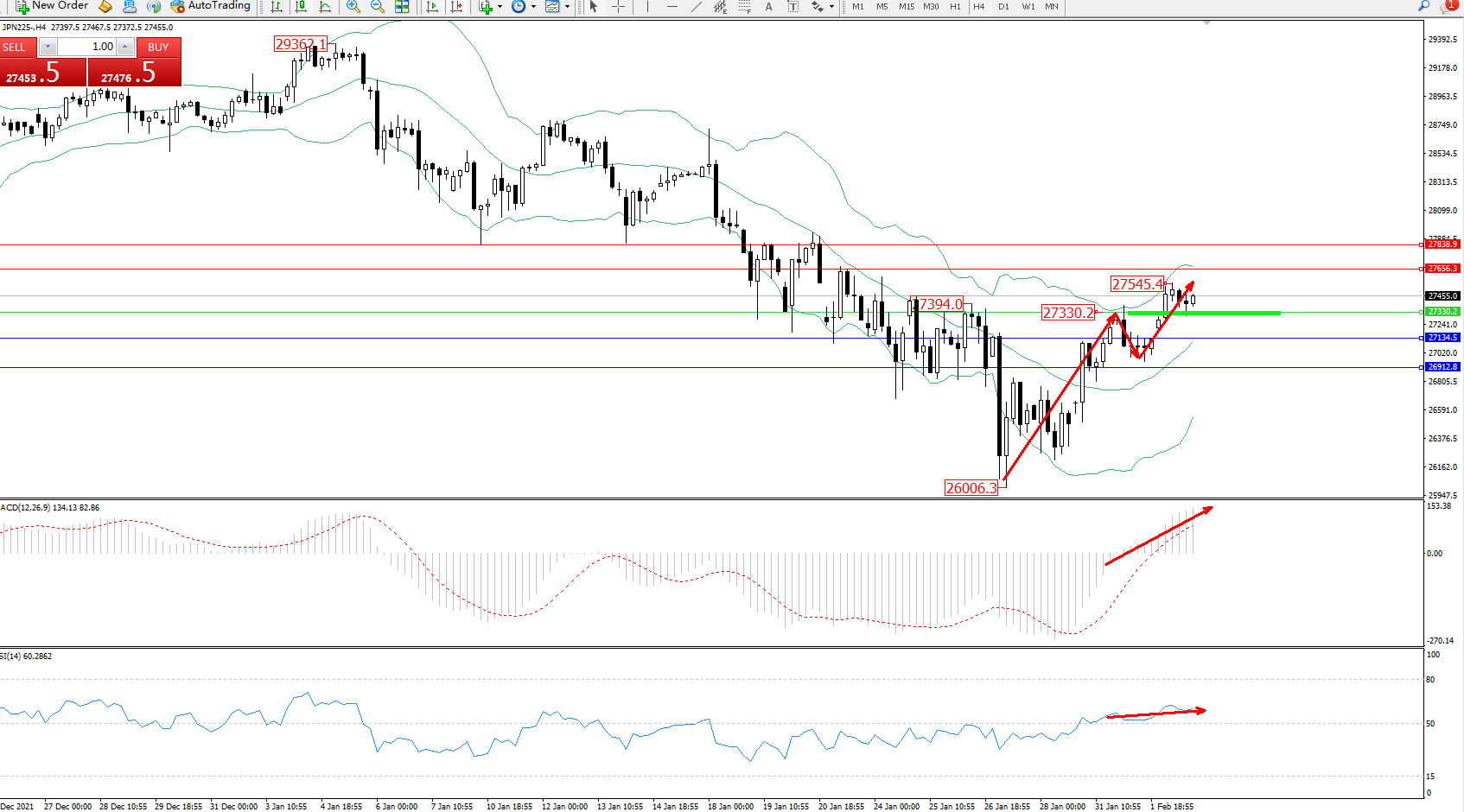 日经指数JPN225——4小时K线图显示: