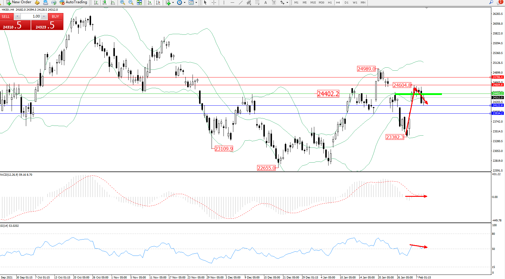 恒指HK50 ——4小时K线图显示: