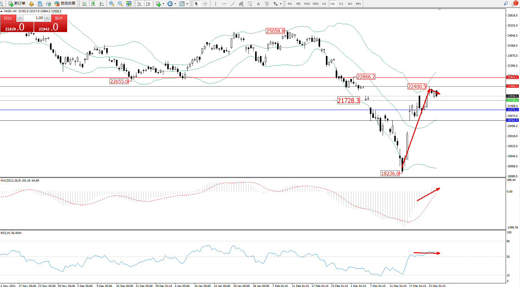 恒指HK50 ——4小时K线图显示:
