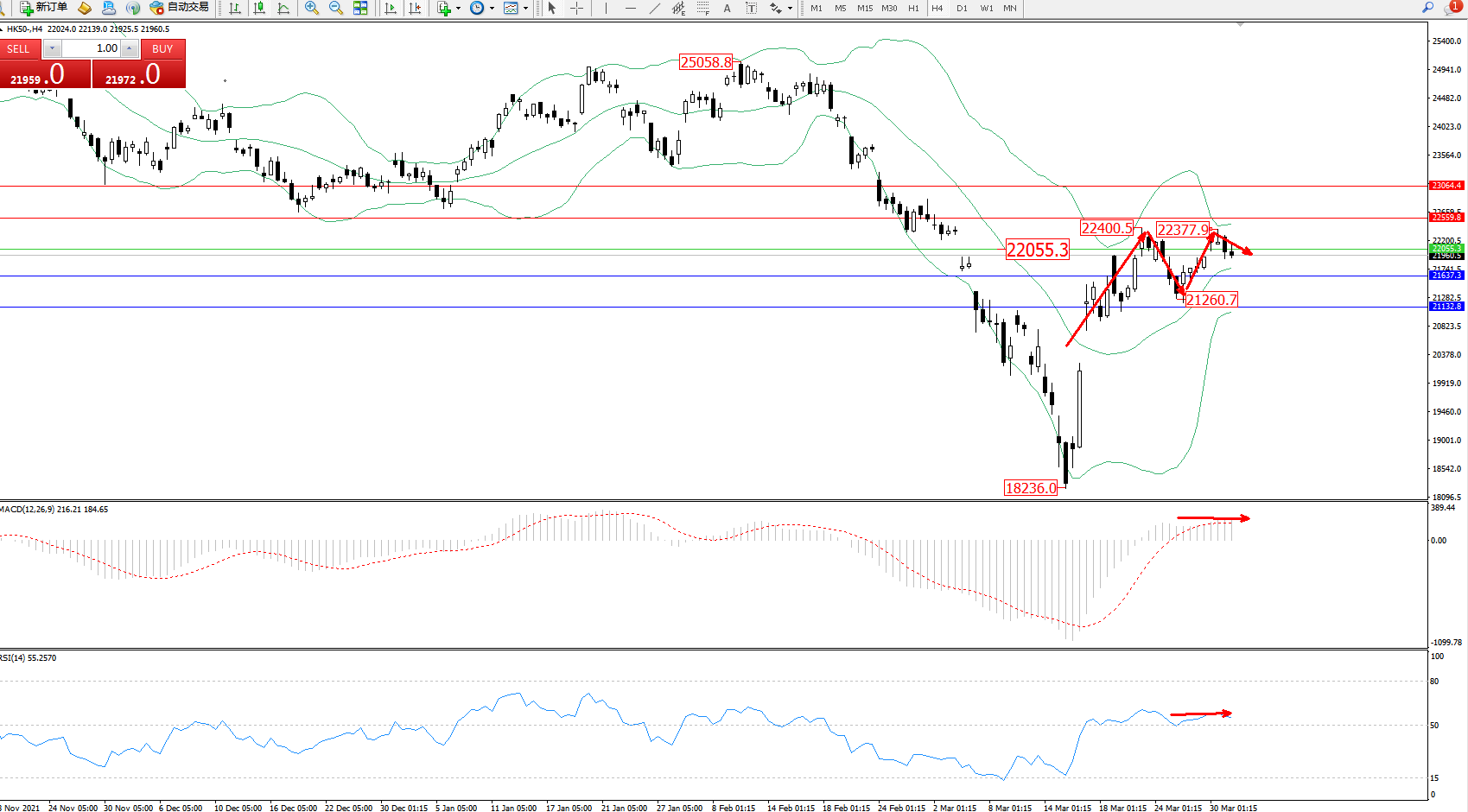恒指HK50 ——4小时K线图显示: