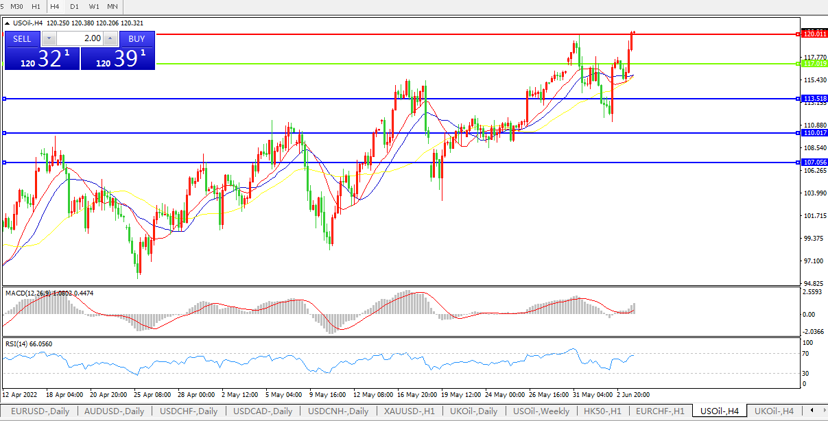 4小时图看,油价迅速拉升,短线极其强势, MACD量能柱伸长,RSI指标再度回升,日内继续走高概率较大。