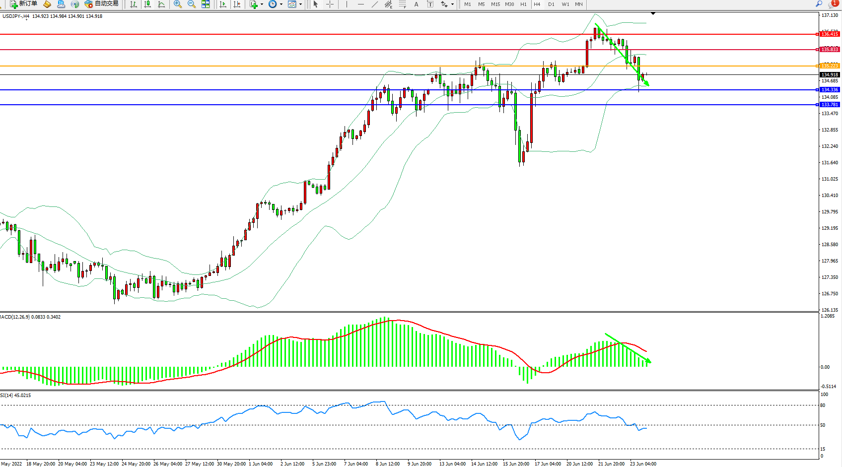 交易策略:135.223下方看跌,目标134.336、133.781