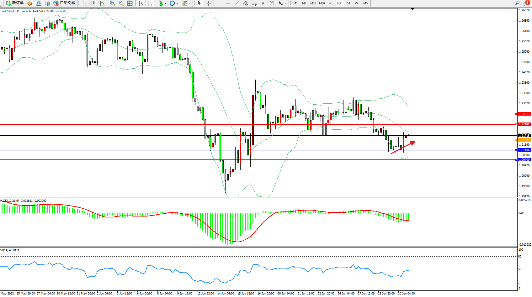 交易策略:1.21525上方看涨,目标1.22181、1.22613