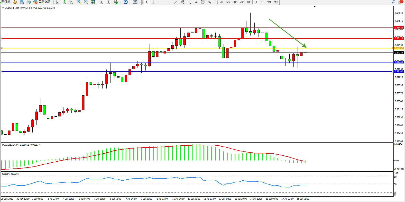 交易策略:0.97842下方看跌,目标0.97445、0.97182