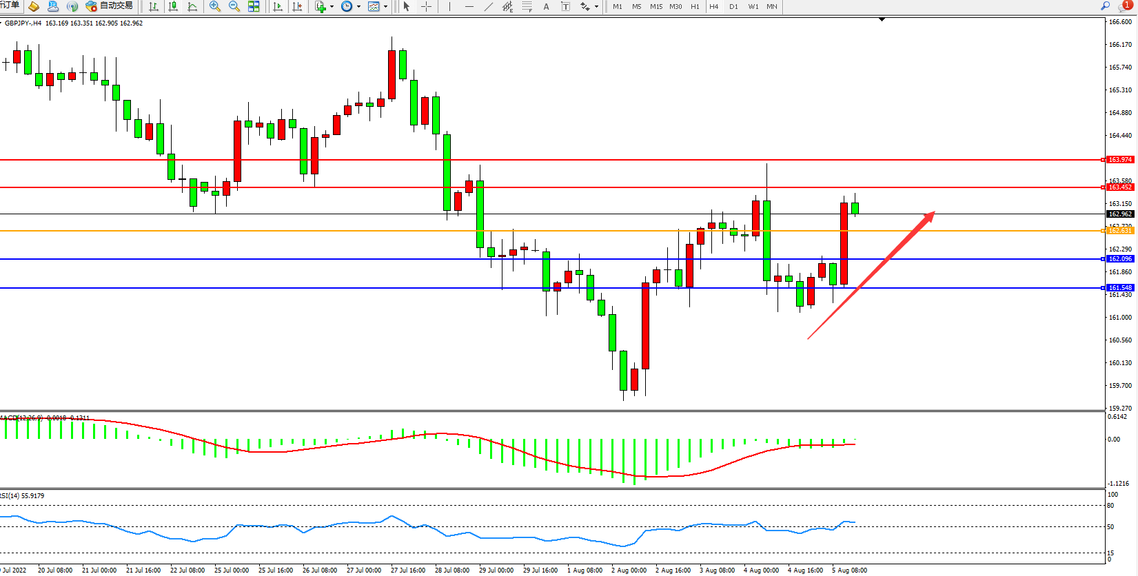 4小时图看:多头动力维持震荡拉升,市场整体看涨情绪持续,MACD指标处于0轴线附近弱势徘徊,RSI指标处于50均衡线上側整理;