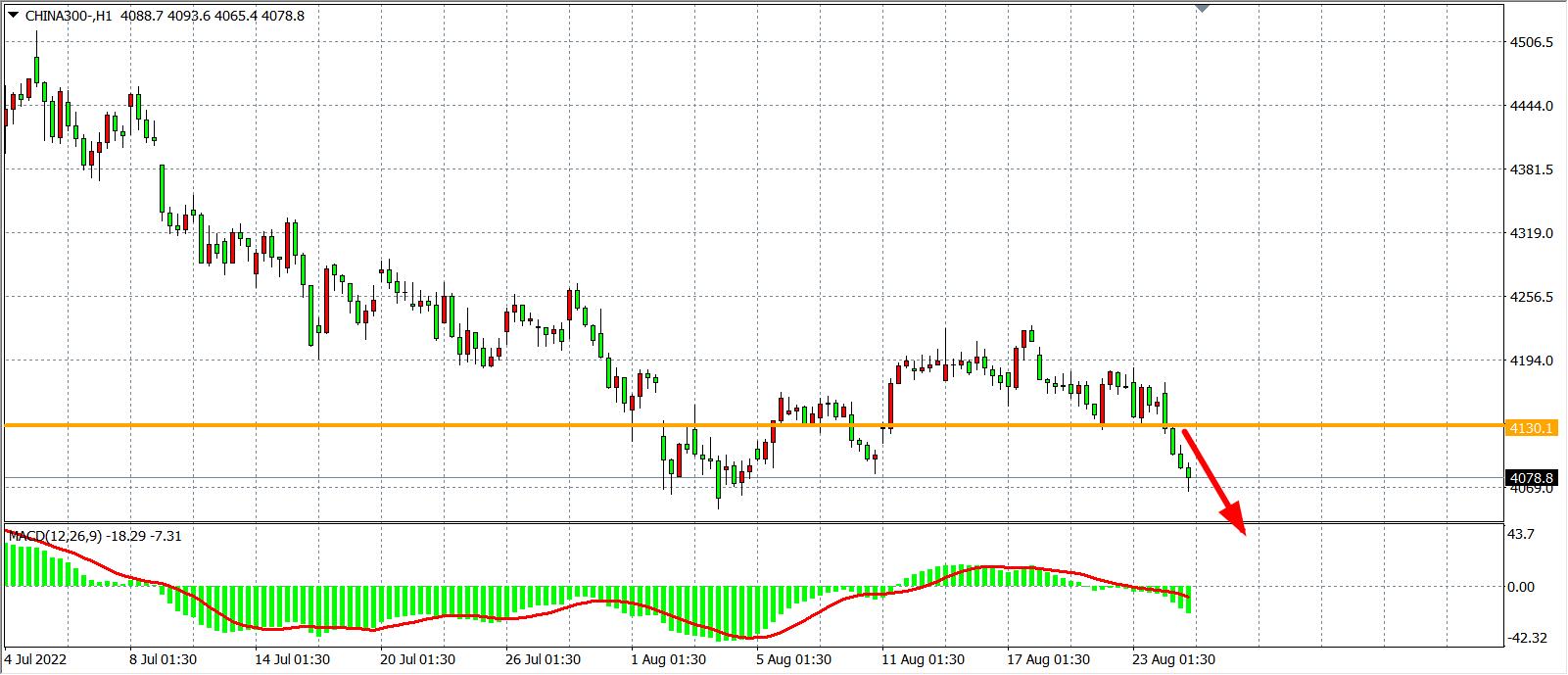 1小时图看,沪深300强势跌穿4130,目前该位已从支撑转化为阻力,同时MACD于零轴之下量能开始放大,预示行情或有进一步下跌空间,日内在4130之下继续看跌,下方目标4050-3970