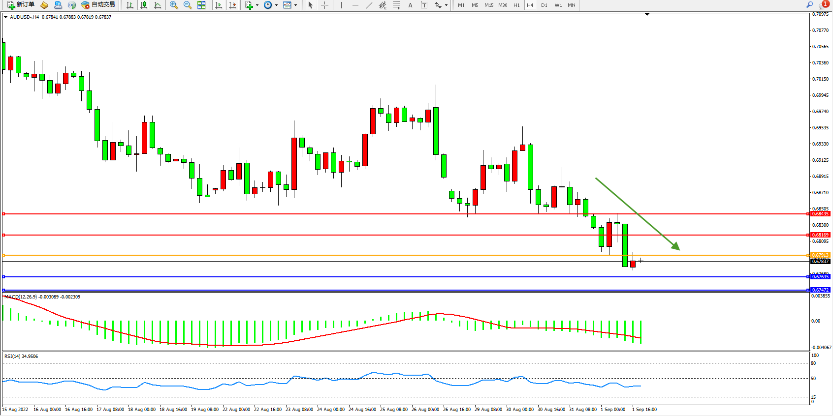 澳元美元AUDUSD——4小时K线图显示: