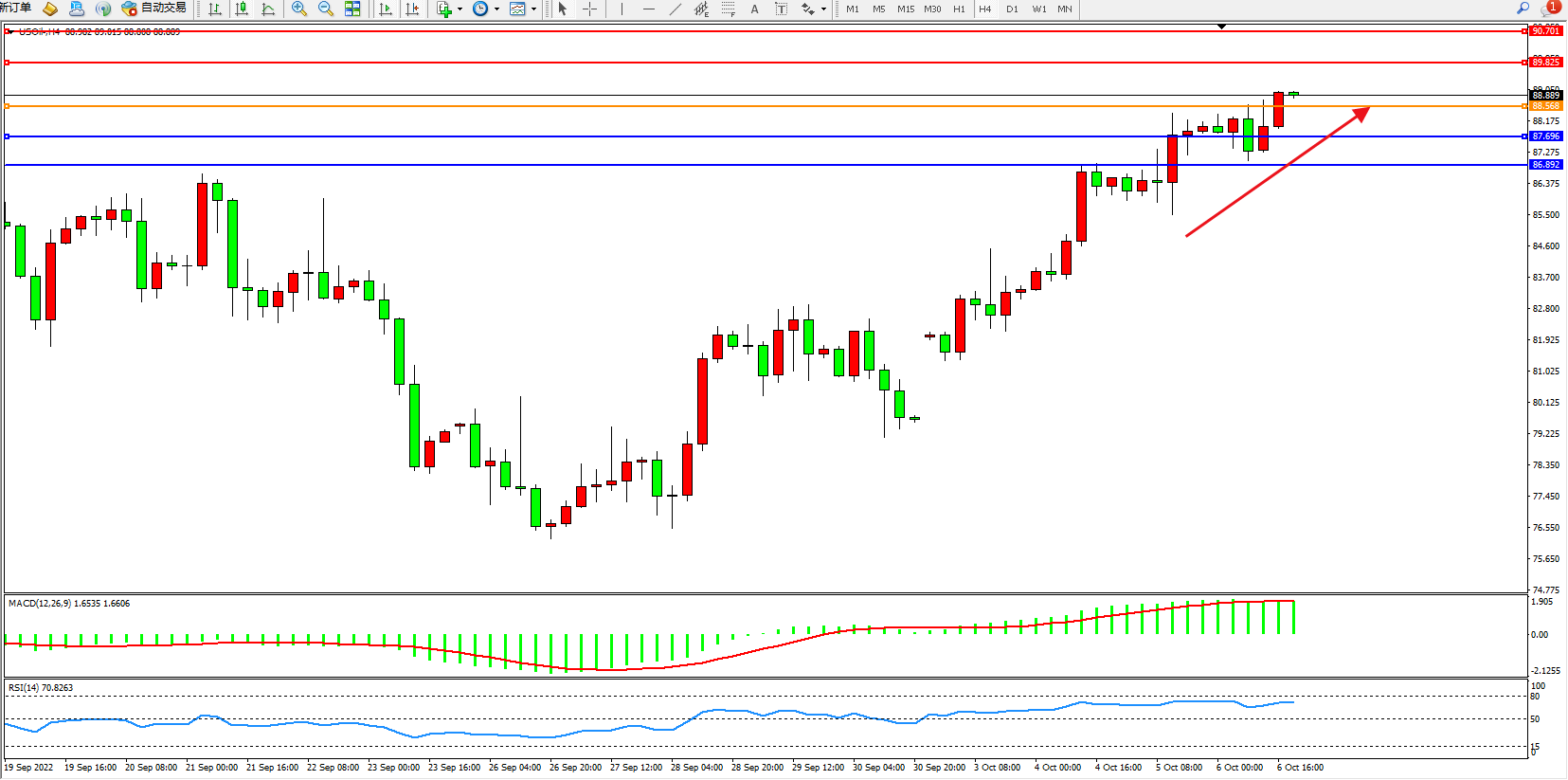 原油USOil——4小时K线图显示: