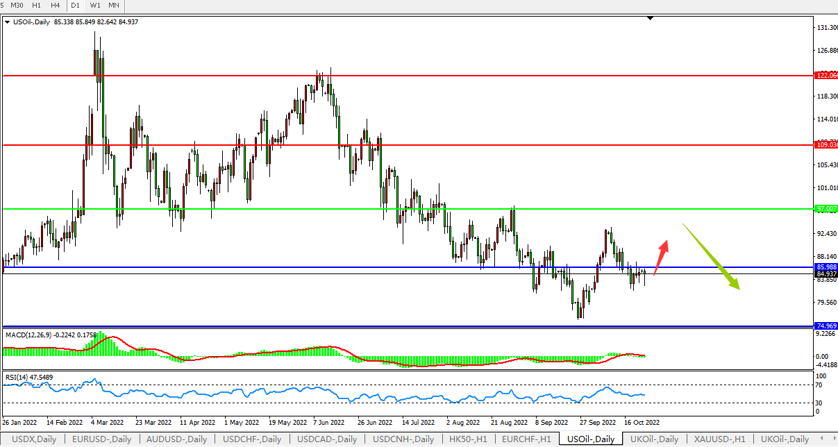 日线图看:油价低位弱势整理, MACD量能柱0轴上方开始缩量,RSI指标走势平缓,短期油价延续整理,后续反弹上攻概率较大。