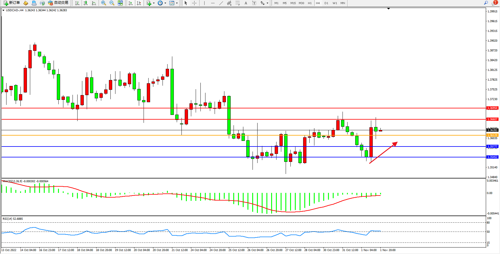 美元加元USDCAD——4小时K线图显示: